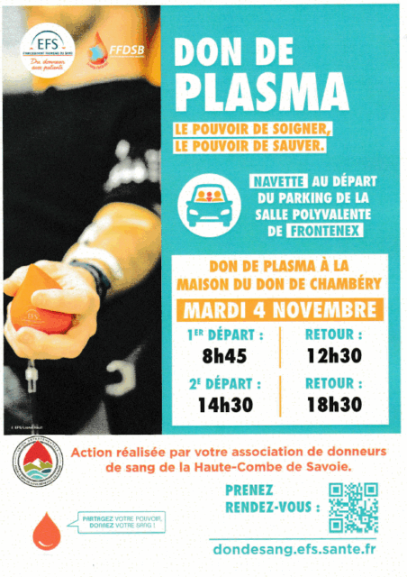 Pour la Savoie, les dons de plasma se font uniquement à Chambéry. Une navette pour les donneurs au départ de Frontenex est organisée une fois par mois. N’hésitez pas à vous inscrire