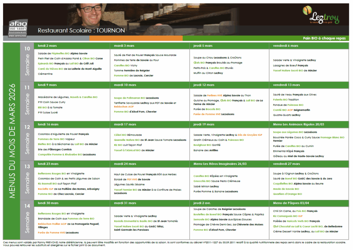 Cantine de Tournon gérée par le Syndicat Scolaire du Val Tamié. Les repas sont fournis par LEZTROY et sont préparés à base de produits frais et locaux. Pour toute information ou inscription, cliquer sur le lien suivant : https://www.tournon-savoie.com/cantine-intercommunale/